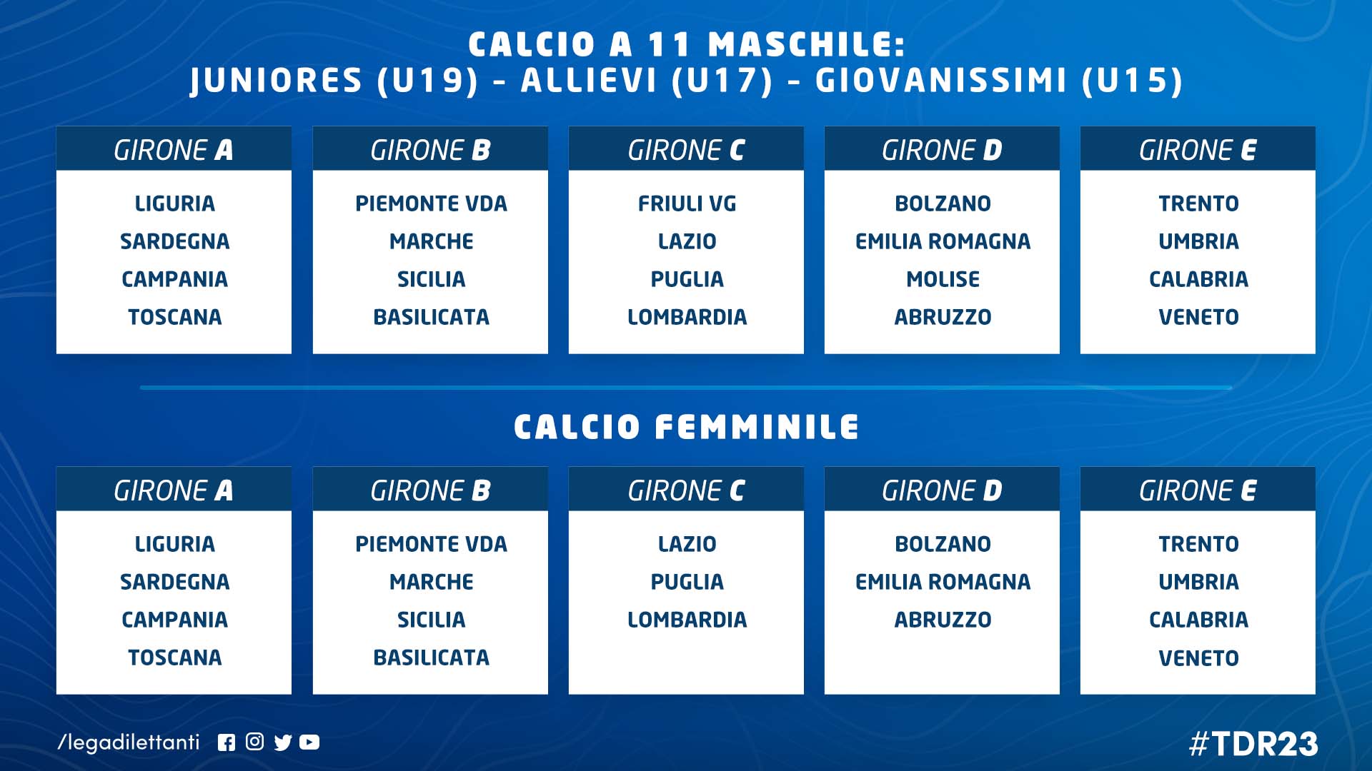 Dopo quattro anni di trepidante attesa torna il Torneo delle Regioni, la competizione che dal 1959 rappresenta l’Italia del presente e del futuro della Lega Nazionale Dilettanti. L'urna ha stabilito la composizione dei gironi dove sono state inserite le 149 Rappresentative giovanili femminili e maschili di calcio a undici e calcio a cinque dei diciotto Comitati Regionali e dei CPA di Bolzano e Trento della Lega Nazionale Dilettanti. Il sorteggio è stato effettuato martedì 20 Dicembre nella sede di Roma della LND in collegamento da remoto con tutti i Presidenti dei CR. Anche per l'edizione numero 59, per la quinta stagione consecutiva, escluse le annate del 2020, 2021 e 2022, è stata confermata la formula che prevede due kermesse riservate rispettivamente al calcio a undici e al futsal in programma dal 21 al 27 Aprile in Piemonte Valle D’Aosta e dal 1 all’8 Aprile in Veneto per dare il giusto risalto a tutte le categorie Juniores (Under 19), Femminile, Allievi (Under 17) e Giovanissimi (Under 15) in entrambe le discipline. Al torneo prendono parte le rappresentative regionali espressione dei rispettivi Comitati, composte da venti calciatrici e calciatori per il calcio a undici, dodici per il futsal, selezionati sui territori.