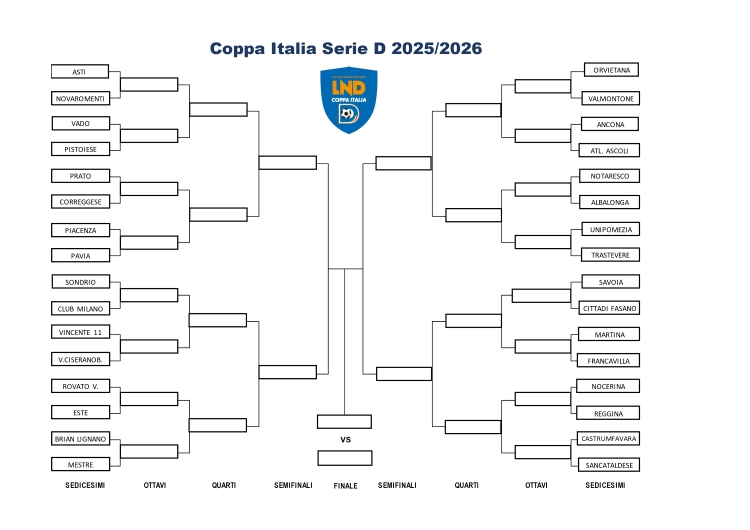 Il Dipartimento Interregionale ha ufficializzato il programma completo dei sedicesimi di Coppa Italia, in calendario mercoledì 22 ottobre alle ore 15. In particolare, si è ricorso al sorteggio per stabilire l’ordine di svolgimento di sei partite in virtù dei risultati maturati nel turno precedente: si tratta di Correggese-Prato, Pavia-Piacenza, Ancona-Atletico Ascoli, Notaresco-Albalonga, Citta’ di Fasano-Savoia e Mestre-Brian Lignano. Quest’ultima è stata posticipata al 29 ottobre (ore 14.30) per la concomitanza del recupero di campionato del Mestre contro il Vigasio. Nella stessa data si giocherà anche l’ultima sfida dei trentaduesimi Milan Futuro-Varesina, la vincente affronterà la Virtus CiseranoBergamo (data da destinarsi).